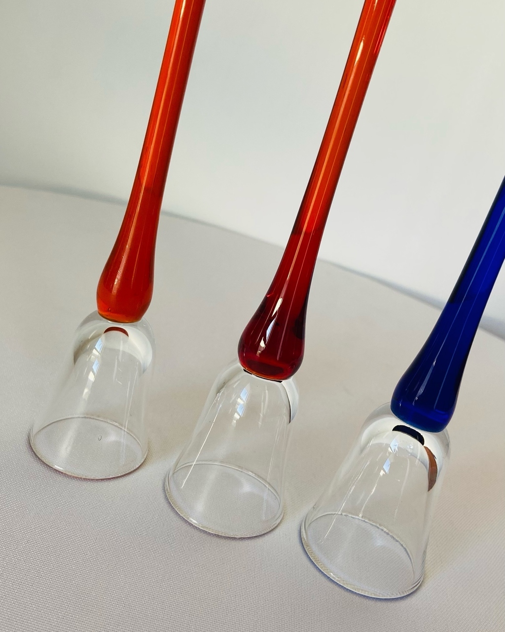 Trio de shots ou aperitivos de vidro com hastes longas sem base. Ideal para cravar em uma superfície como areia, grama ou praia.